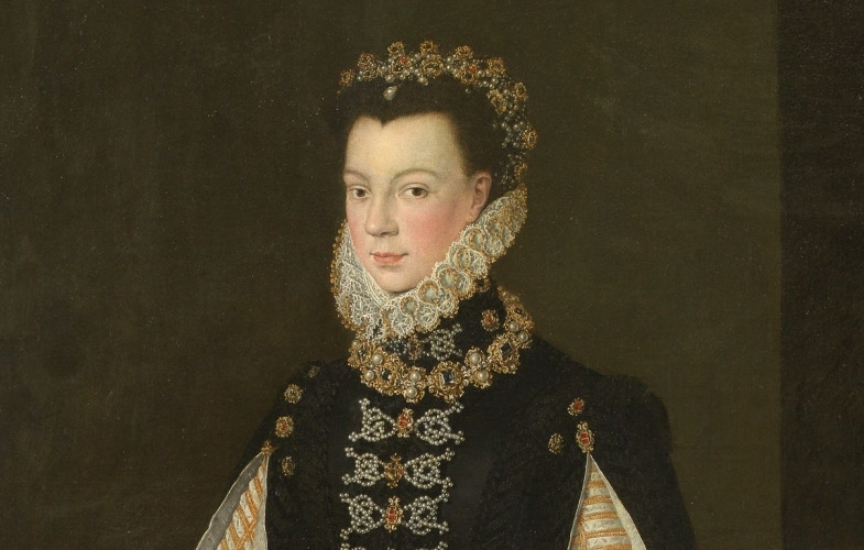 Isabel de Valois (1545-1568) contrajo matrimonio en 1559 con Felipe II, en cumplimiento del Tratado de Cateau-Cambrais que asentó la paz entre Las Españas y Francia. Era tan solo una niña de trece años cuando cruzó la frontera de los Pirineos para comenzar una nueva vida al lado del Rey más poderoso de todo el mundo en aquel momento. El monarca decidió que la Condesa viuda de Ureña se convirtiera en la camarera mayor de su joven esposa, un personaje que también forma parte de la historia de La Soledad de Becerra. Entre su ajuar, Isabel de Valois trajo consigo un cuadro en el que se representaba Las Angustias y Soledad de la Virgen, arrodillada y rezando ante la cruz desnuda.