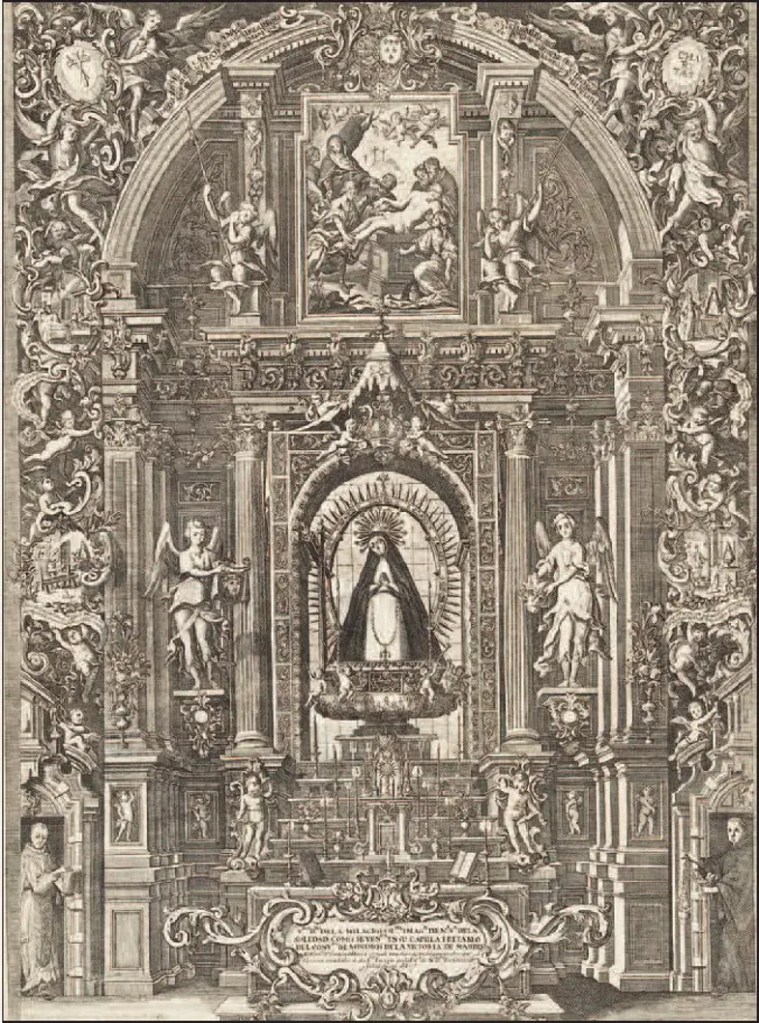 La devoción a la Virgen de la Soledad del Convento de la Victoria creció exponencialmente, en gran medida porque comenzó a ganar fama milagrera. Esto también fue uno de los motivos por los cuales se decidió emprender la construcción de una capilla propia en la iglesia conventual para dar culto a la talla. Este espacio fue finalizado e inaugurado en 1611, mientras que cincuenta años más tarde se encargaría el gran retablo barroco en el que se colocó la imagen de la Soledad de Becerra. El ático estaba coronado por una pintura de Francisco Rizi, en la que se representaba a Cristo en el sepulcro, la cual acompañaba a la perfección el tema de la soledad y el dolor de la Virgen María tras la muerte de su hijo.